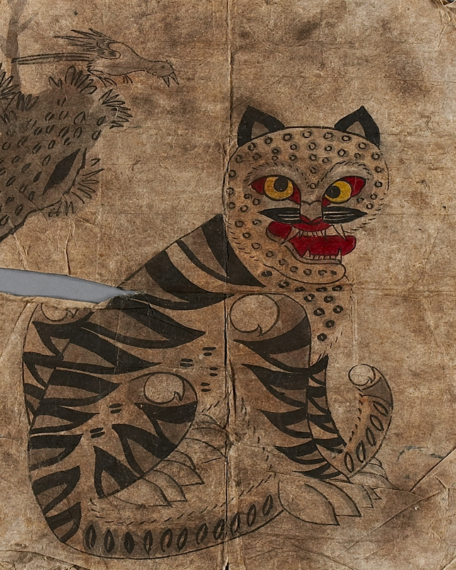 Joseon dynasty. It features a powerful tiger to repel misfortune alongside a magpie, a bearer of good news. This combination embodies the heartfelt wishes of our