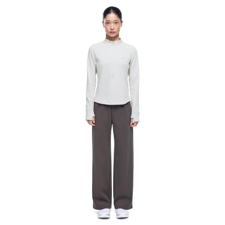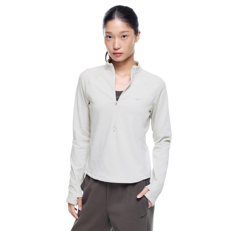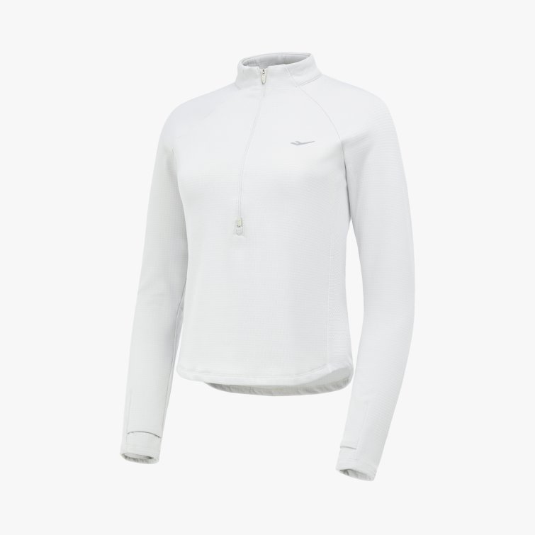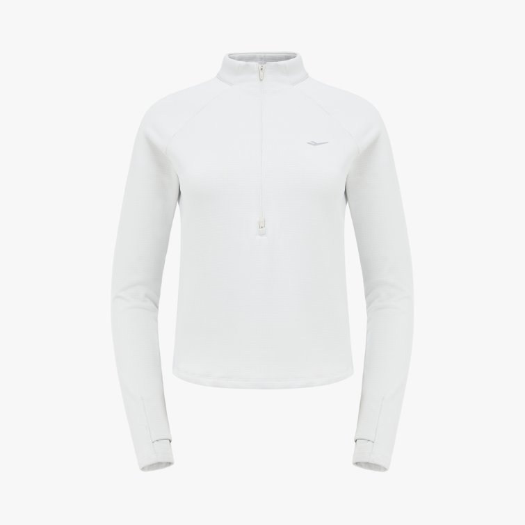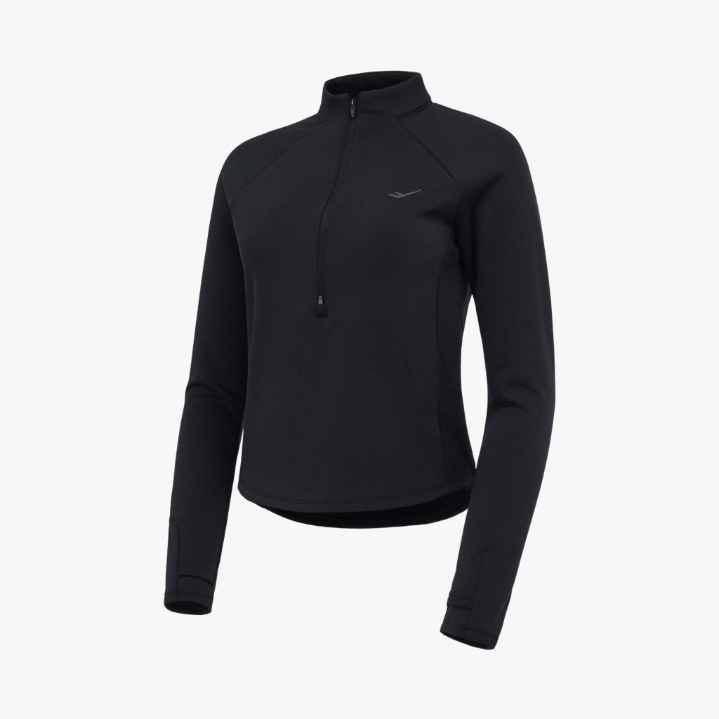 신축성과 보온성을 갖춘 동계 여성 하프 집업 티셔츠로, 엄지홀 구조와 지퍼 통풍 설계, 리플렉티브 디테일을 적용해 러닝 시 안정적인 착용감과 가시성을 높인 아이템입니다.